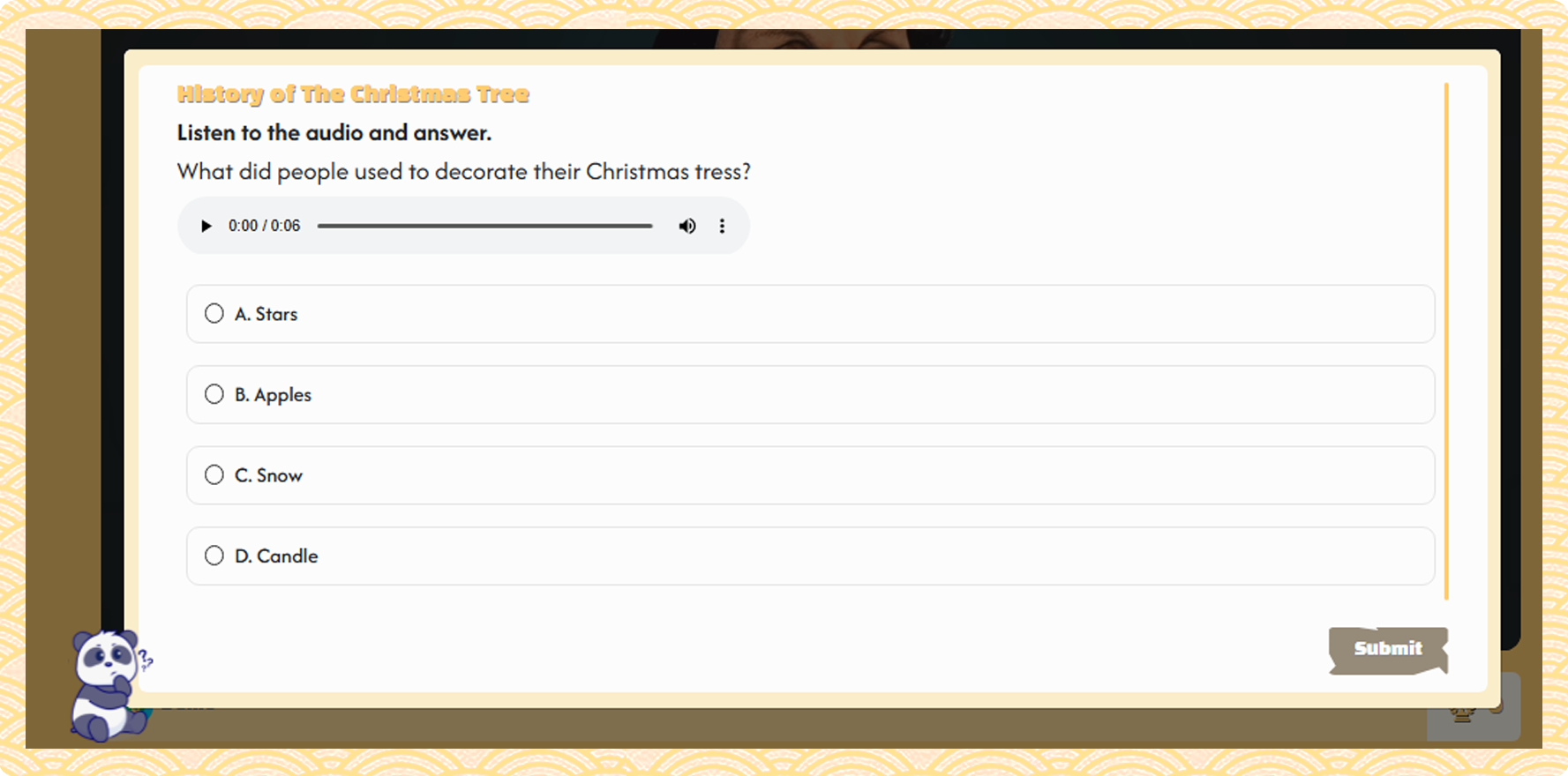 Learn about the origins of the Christmas tree with our interactive video quiz. This video quiz explores how the tradition began, why we hang lights, and the unique customs from around the world. Perfect for students of all levels, it's a fun way to test Christmas knowledge, keeping them attentive with questions that pop up as they watch the video.